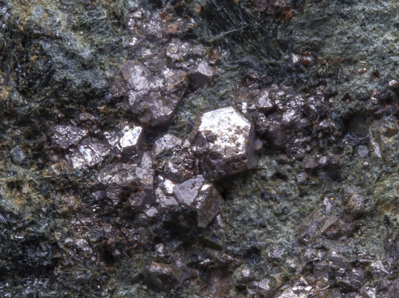 Cristalli cubo-ottaedrici di 2 mm inglobati nella roccia della miniera del Ginevro all’isola d’Elba.