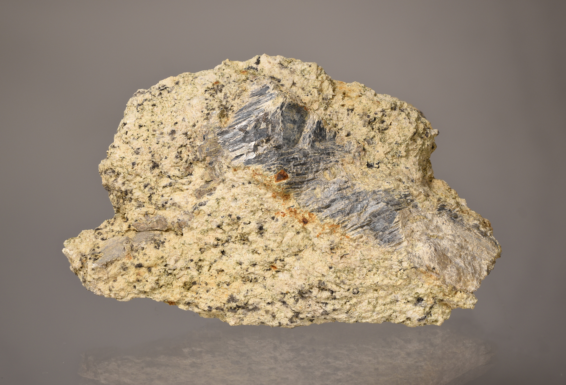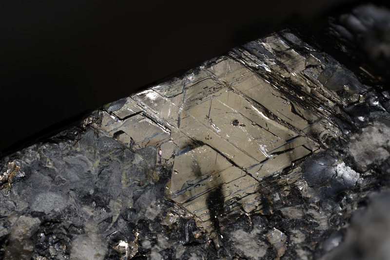 Bismuto nativo, aggregato di cristalli lamellari parzialmente alterati inclusi nella roccia idrotermalizzata a quarzo e “adularia”. Campione di 8 × 5 × 3 cm; le dimensioni massime della massa di bismuto nativo sono di 4 × 2 cm. Punta del Fenaio, Isola del Giglio, Grosseto. Coll. V. Marinai.